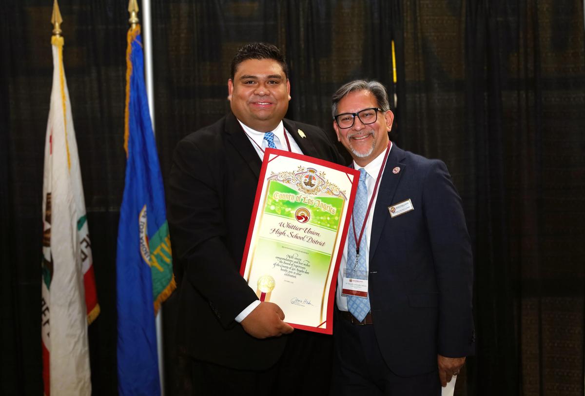 Whittier Union Celebrates Community, Student Success at Inaugural State of the District Event Whittier Union High School District spotlighted its success in preparing students for bright futures during its inaugural State of the District event on Oct. 1, engaging nearly 200 community members, elected officials, students, families, and staff with a catered dinner reception, live student performances, and a program that emphasized strong community partnerships and a deep commitment to academic excellence. The event, held at California High School and generously sponsored by Los Angeles County Supervisor Janice Hahn, was attended by state leaders such as Senator Bob Archuleta and Assemblywoman Blanca Pacheco. Local leaders in attendance included Whittier Mayor Joe Vinatieri, Whittier City Councilmembers Cathy Warner and Mary Ann Pacheco, Whittier City Manager Conal McNamara, Santa Fe Springs Mayor Bill Rounds, Norwalk Councilmember Ana Valencia, and La Mirada City Councilmember Michelle Velasquez Bean. The talents of Whittier Union students were on display throughout the event; the California High School combined choir delighted the audience with a powerful performance, while the Whittier High School Jazz Band entertained guests during dinner. Student leaders from across the District and members of the Superintendent’s Advisory Council were also present, underscoring the District’s commitment to student voice and leadership. To open the State of the District, Whittier Union Board President Dr. Russell Castañeda Calleros thanked the community for their attendance and steadfast support. “Whittier Union continues to thrive because our community always puts students first,” Castañeda Calleros said. “Tonight is an opportunity to celebrate our shared successes and reaffirm our commitment to preparing every student for the future. In closing, I proclaim that this Board and this District are united in affirming that every student, regardless of background, has the right to learn in a safe learning environment and the right to receive a public education to fully develop their God-given gifts, pursue their academic and professional goals, and make a positive contribution to our democratic republic.” Following opening remarks, the District’s Executive Cabinet presented an overview of Whittier Union’s progress and vision for the years ahead. The presentation emphasized the District’s investment in personnel and educational services, as well as updates on facility improvements underway across campuses. District leaders highlighted recent efforts to further enhance the educational experience for students, which included newly sanctioned CIF sports such as girls flag football, cheer, and stunt, along with robust academic programs like honors, Advanced Placement, Puente, Advancement Via Individual Determination (AVID), and a dual enrollment partnership with Río Hondo College. The District shared its ongoing efforts to modernize classrooms with upgrades such as audio/video projection systems, wireless internet access points, LED interior lighting, standardized instructional technology, and more. “When I think of Whittier Union, I think of the journey we’ve shared over the past 20 years, committed to working together and doing Whatever It Takes to ensure student success,” Superintendent Dr. Monica Oviedo said. “Community members and prospective high school parents often ask me where they should send their students, and I tell them that every one of our schools is demonstrating success and offers unique programs to support students. We hope our State of the District helped highlight those successes. Thank you to everyone who contributed—because, as my theme for the 2025-26 school year reminds us, ‘Connected We Shine Brighter.’” PHOTO CAPTIONS WUHSD_SOD1: Whittier High School’s Jazz Band impresses guests with a lively performance during the State of the District dinner reception on Oct. 1, earning applause from community members. WUHSD_SOD2: From left to right: Ivan Sulic, Field Deputy for Los Angeles County Supervisor Janice Hahn, and Whittier Union Board President Dr. Russell Castañeda Calleros celebrate the success of the District’s inaugural State of the District on Oct. 1. The event was sponsored by Supervisor Hahn. WUHSD_SOD3: From left to right: Whittier Union Board Clerk Josefina E. Canchola, Board President Dr. Russell Castañeda Calleros, Vice President Irma Rodríguez Moisa, and Board Member Jaime López gather with student leaders from across the District during the State of the District event on Oct. 1. WUHSD_SOD4: California High School’s combined choir opens Whittier Union’s inaugural State of the District on Oct. 1 with a powerful performance, setting the tone for an evening of community, collaboration, and celebration of student success. WUHSD_SOD5: Whittier Union Superintendent Dr. Monica Oviedo is joined by student leaders representing WUHSD campuses during the Oct. 1 State of the District event.