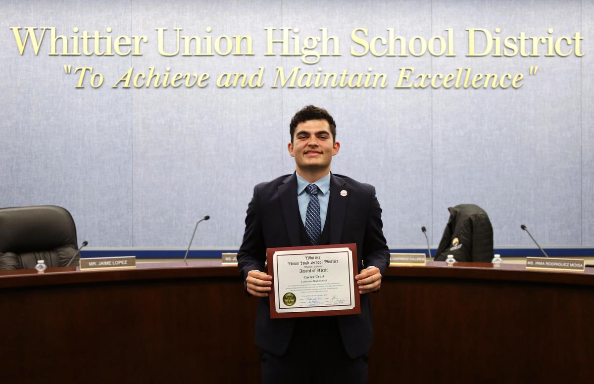 Whittier Union Senior Receives Award of Merit for Exemplifying Hard Work, Kindness Whether in the classroom or out in the community, California High School senior Carter Crail leads with purpose, earning admiration for his academic excellence, strong character, and dedication to continuous growth. Crail boasts a 4.47 GPA, with 26 semester units of honors and Advanced Placement (AP) courses going into his senior year alone. Crail’s dedication to civic service is rooted at home. He grew up being inspired by his mom, a lifelong community servant, and said he believes in supporting the community that nurtured him. The Whittier Union Board of Trustees recognized Crail with an Award of Merit during its Oct. 14 Board meeting for his exceptional character and dedication to academics. Crail addressed the packed Board room, thanking his Condor support system and parents for helping him reach this point. In his speech, Crail shared that his parents serve as the main examples in his life for who he should strive to become. “I would like to give my thanks to the Board for giving me the opportunity to represent Cal High as a school as well as myself as an individual. I also want to give thanks to my teachers, who not only inspired me to love learning, but also motivated me to constantly be a better person, and better than every year before,” Crail said. “Cal High’s been an amazing school for me. I'm provided with a culture that is driven by success, with multiple opportunities to not only be content with where I'm at, but shoot for the stars and make sure I keep going.” As president of California High School’s Interact Club for the past two years, Crail has led his peers in organizing school and community service projects that make a lasting impact. He was also president of the school’s Model United Nations for one year, and has led three successful Cal High Conferences – holding the most college-level awards out of any delegate in CHS history. Additionally, Crail has served as a Puente cabinet member for four years and was named Puente Student of the Year during his freshman year, and held the title of vice president of philanthropy for two years. This past summer, Crail served as the Cal High Boys and Girls State Representative and the Boys State Delegate, where he was elected as a senator for the Boys State System. During this time, he was actively involved in writing and establishing laws, demonstrating his pursuit of civic responsibility, and unlocking a new way to give back to those around him. Crail, a three-year varsity wrestler, snatched the prestigious DeWitt IronMan Award for Excellence on and off the mat, and placed ninth in his weight class during last year’s CIF-Southern Section competition. After graduation, Crail said he plans to pursue his interests in energy and global policy and double major in nuclear engineering and political science at either the University of California, Berkeley or California Institute of Technology. “What is so special about Carter is he uses his intellect to inspire, not overshadow,” Principal Shana Jones said. “He motivates others not through demands, but by setting a passionate and proactive example. Peers describe him as kind, helpful, and driven, noting that he listens to feedback, truly shares the spotlight, and he roots for those around him.” PHOTO CAPTION WUHSD_AWARDOFMERIT1: California High School senior Carter Crail was honored with an Award of Merit, presented by the Whittier Union Board of Trustees on Oct. 14, celebrating his academic determination and excellence, as well as his kindness and leadership.